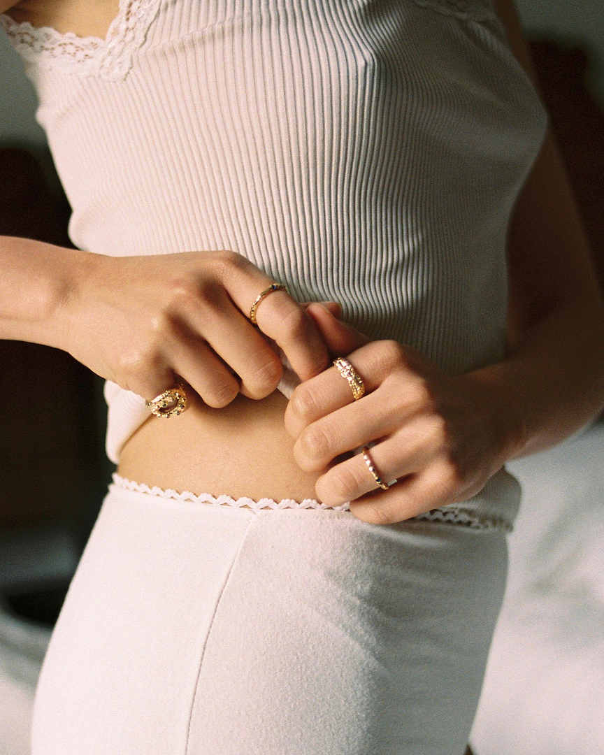 Todas as jóias (brincos, pulseiras, braceletes e anel) pensadas e desenhadas por mim, são feitas de forma artesanal, por dois ourives no norte de Portugal. Penso que nos podemos sentir bonitas e especiais sem comprometer o futuro do planeta. Em outras palavras, é por isso que quero fazer parte de uma moda mais conscienciosa, mais lenta, sem coleções. Acredito naquilo que chega para ficar. Dessa forma, só uso prata e ouro reciclados, que depois de devidamente fundidos, ganham uma nova vida. Bem como o meu compromisso com a sustentabilidade continua com a utilização de embalagens de cartão, também reciclado e sem cola, o que me deixa muito feliz.