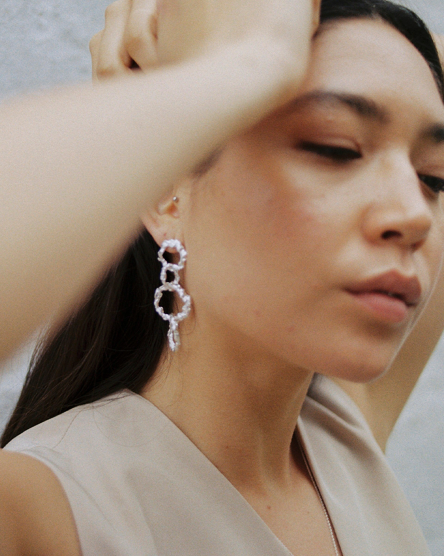 Todas as jóias (brincos, pulseiras, braceletes e anéis) pensadas e desenhadas por mim, são feitas de forma artesanal, por dois ourives no norte de Portugal. Penso que nos podemos sentir bonitas e especiais sem comprometer o futuro do planeta. Em outras palavras, é por isso que quero fazer parte de uma moda mais conscienciosa, mais lenta, sem coleções. Acredito naquilo que chega para ficar. Dessa forma, só uso prata e ouro reciclados, que depois de devidamente fundidos, ganham uma nova vida. Bem como o meu compromisso com a sustentabilidade continua com a utilização de embalagens de cartão, também reciclado e sem cola, o que me deixa muito feliz.